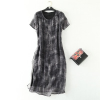 原创高端女装新款时尚真丝印花拼接丝麻坑条气质连衣裙灰色