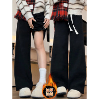 黑色加绒运动裤女秋冬季加厚羊羔绒棉裤外穿直筒宽松保暖阔腿卫裤
