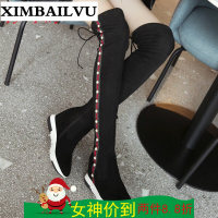 品牌2017韩版秋冬新款弹力绒靴平底高筒靴长靴圆头低跟包腿过膝靴女靴女鞋黑黑色
