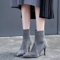 高跟短靴女2017秋冬新款真皮弹力袜靴性感百搭细跟裸靴加绒尖头鞋