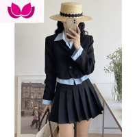 七斓辰米范 黑色v领短款西装外套女套2023新款高腰百褶半身裙套装