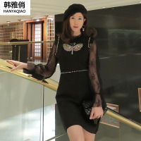 韩雅俏(HANYAQIAO)2018新品新款女重工镶钻水晶蜻蜓钉珠拼蕾丝袖修身连衣裙