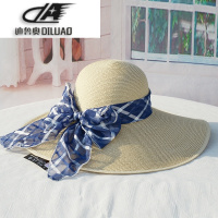 帽子女夏天潮百搭大檐沙滩草帽度假海边防晒遮阳帽蓝白格子太阳帽