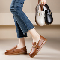 头层牛皮单鞋女春季新款复古平跟百搭豆豆小皮鞋休闲妈妈鞋