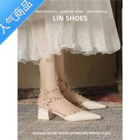 SUNTEK裸色高跟鞋女单鞋法式粗跟尖头铆钉包头凉鞋2023年春秋新款中跟夏
