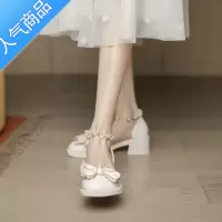 SUNTEK粗跟玛丽珍伴娘单鞋一字带米白色高跟鞋女学生黑色小皮鞋凉鞋夏季
