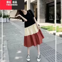 YIBUSHENG加大码女装春季新款胖mm显瘦拼色撞色短袖连衣裙藏肉T恤裙200斤