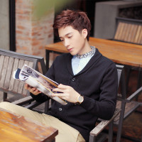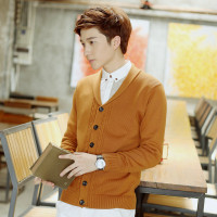 新品秋款男士纯棉翻领毛衣开衫青年纯色麻花修身针织衫外套厚