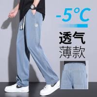 莱赛尔冰丝天丝男装裤子青少年港风宽松直筒牛仔裤松紧腰系带长裤