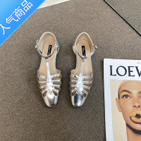 SUNTEK法式包头凉鞋银色镂空平底女鞋2023夏新款网红T字扣带罗马猪笼鞋