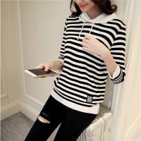 2017秋季新款黑白条纹针织衫宽松连帽毛衣女薄打底衫七分袖外套潮