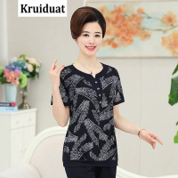 Kruidvat中老年人女夏装2017时尚妈妈装色印花短袖上衣松紧裤腰套装