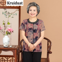 Kruidvat中老年人女夏装2017烫金印花圆领短袖上衣衬衫松紧裤套装ZLL