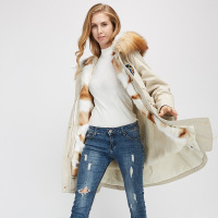 冬韩版时尚红狐毛领狐狸毛门襟可拆卸獭兔内胆长款派克大衣女米色