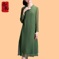 2018春夏新款飘带中国风印花仿真丝桑蚕丝连衣裙女宽松红色雪纺裙
