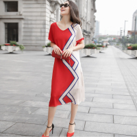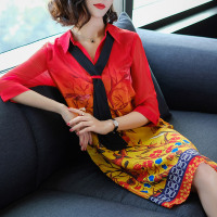 春夏新款宽松显瘦气质淑女印花真丝连衣裙女桑蚕丝a字裙红色