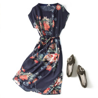 重磅真丝连衣裙女桑蚕丝双绉藏青玫瑰园落肩袖真丝连衣裙新款女装草原风华