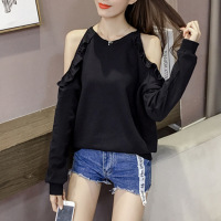 秋装新款韩版甜美木耳边漏肩长袖卫衣女宽松套头针织小衫T恤上衣