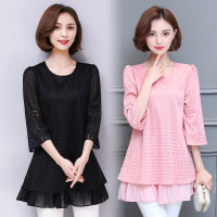 宽松适中套头七分袖荷叶边T恤圆领蕾丝衫雪纺衫纯色甜美优雅2017年秋季