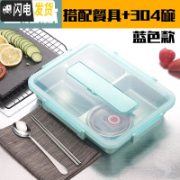 三维工匠304不锈钢饭盒保温带盖成人食堂餐盒大容量餐盘分隔型4格便当盒 透明蓝新4格+304汤碗餐具