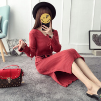秋冬中长款过膝打底毛衣裙女韩版收腰修身v领套头纯色针织连衣裙