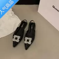 SUNTEK平底小香风黑色包头凉鞋女鞋子2023春夏季配裙子法式尖头水钻单鞋