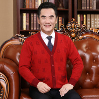 秋冬新款中老年男百福开衫毛衣红色爸爸装羊绒衫外套加厚送礼红色