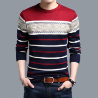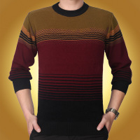 男式毛衣长袖T恤宽松圆领中年冬季加厚条纹打底针织衫男红色