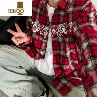 YANXU日系citybo红色格子衬衫男长袖刺绣翻领少年感衬衣薄款hoodie外套
