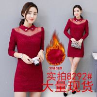 2017新款秋冬连衣裙加绒蕾丝打底衫女长袖中长款修身加厚保暖上衣