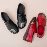 春秋季新款真皮女鞋民族风单鞋百搭平底豆豆鞋女复古中老年妈妈鞋