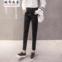 YANXU深蓝牛仔裤男个性破洞补丁重工烫钻印花潮牌修身小脚百搭显瘦长裤