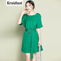奈琴尔2017夏季新款女装时尚简约绿色连衣裙女五分袖圆环腰带A字裙YQ绿色