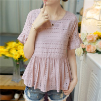 2018夏装T恤女喷色点点镂空大裙摆高腰喇叭袖娃娃衫女五分袖上衣