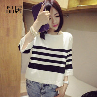 2018秋新款中袖T恤韩版女装五分袖针织衫打底宽松短袖条纹上衣