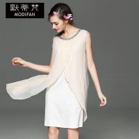 默蒂梵2017春夏季新款镶钻圆领真丝拼接宽松大码女装无袖连衣裙