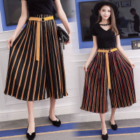 薇侣2017夏季新款条纹高腰裤裙雪纺百褶阔腿裤女九分休闲裤