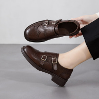 26春季新款手抓牛皮手工英伦风乐福鞋女复古做旧花布洛克小皮鞋