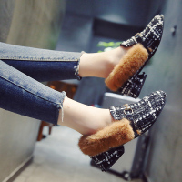 新款韩版百搭毛毛鞋秋冬中跟单鞋方头豆豆鞋时尚格子学生女鞋