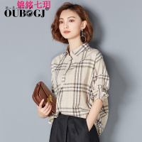 锦铭七玥棉格子衬衫女2017秋季新款宽松韩版前短后长上衣女七分袖