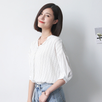 2018夏装新款韩版v领百搭竖条纹衬衫女式七分袖衬衣前短后长上衣