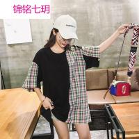 锦铭七玥夏季孕妇装时尚短袖T恤拼格子中长上衣宽松大码潮妈装