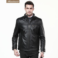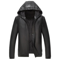 2017海宁新款男士真皮皮衣休闲时尚单皮带帽男式皮夹克黑色