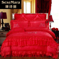 珊诗丽婚庆四件套大红蕾丝全棉刺绣粉色六八十件套床品喜庆结婚床上用品