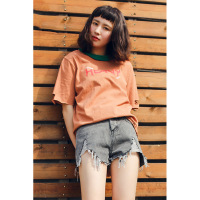 蜜妃儿夏装新款个性拼色领字母破洞t恤女短袖宽松学生闺蜜装