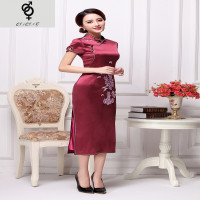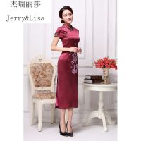 杰瑞丽莎2016春夏新款红色长款真丝绣花旗袍连衣裙红色