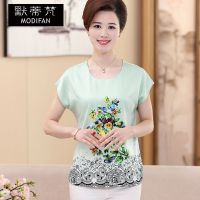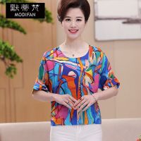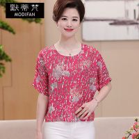 默蒂梵夏装新品中老年大码妈妈装印花圆T恤中年女装真丝缎蝙蝠袖上衣