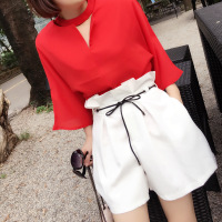 薇侣2017挂脖V领雪纺衫蝙蝠袖上衣衬衫女+高腰纯色宽松休闲阔腿短裤