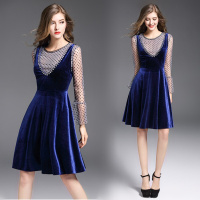 冬装新款连衣裙女韩版气质拼接波点网纱抹胸丝绒修身假两件连衣裙