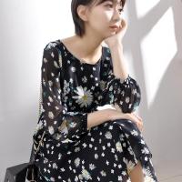 小菊花真丝连衣裙女碎花桑蚕丝长裙九分袖收腰显瘦A字裙灯笼袖